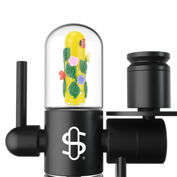 Bring a little sunshine into your life with this "Garden Variety Collection," featuring a beautiful entanglement of lush ivy, vibrant flowers and a red butterfly set against a bright yellow backdrop. Replace your upstem on any Stündenglass Kompact with this percolating Garden Variety stem!